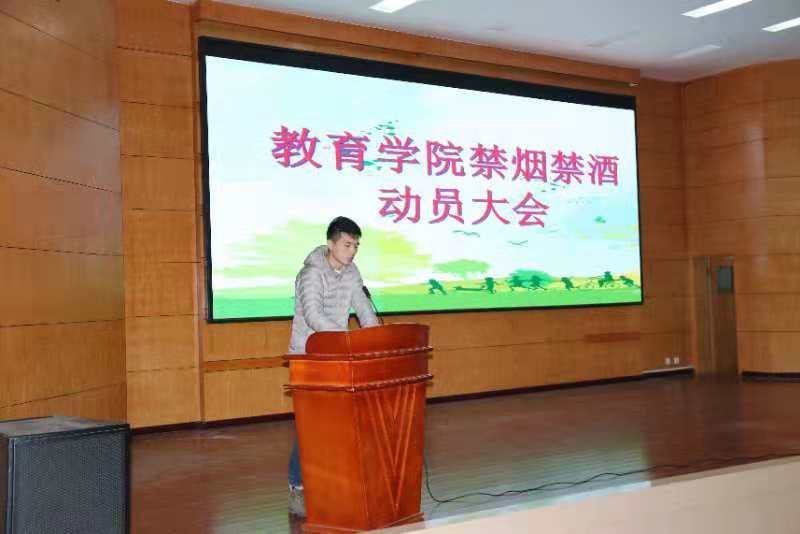 为推进健康教育、素质教育和精神文明工作建设,提高学生对烟酒危害的认识,2018年11月8日,教育学院集中全体男生召开大会,开展“禁烟禁酒我承诺,文明校园我践行”教育活动。副院长韦恒文出席活动并讲话。
