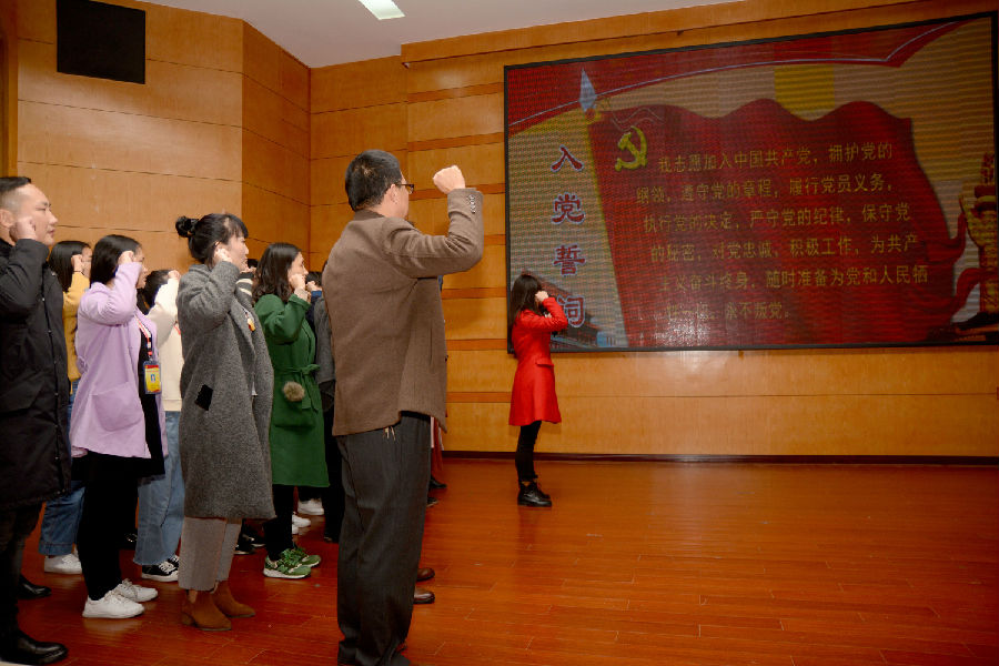 在总支宣传委员熊芬同志的带领下,教育学院全体教师党员、学生党员、预备党员集体重温了入党誓词。
