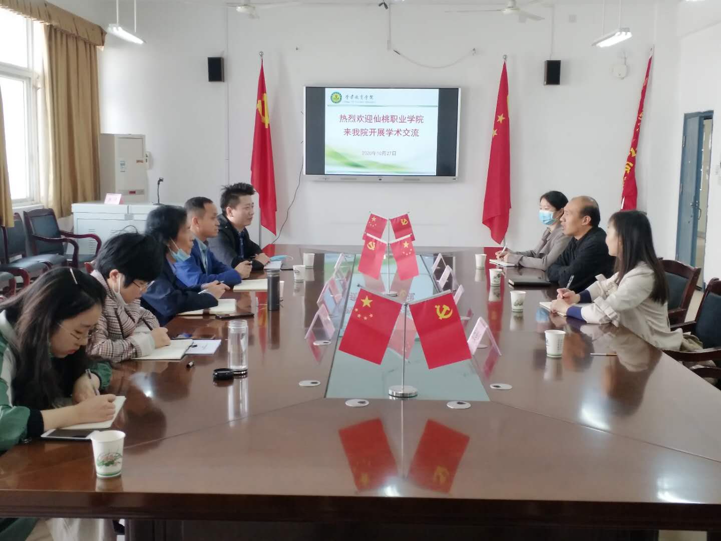 2020年10月27日,教育学院党总支书记王权海、副院长熊芬、学前教研室主任怀冠菊一行来到湖南民族职业学院学前教育学院考察交流,受到湖南民族职业学院学前教育学院院长王志平等领导热情接待。双方就专业办学历史、专业建设、专业申报、质量提升工程、技能竞赛经验等方面进行了深入且广泛的交流。