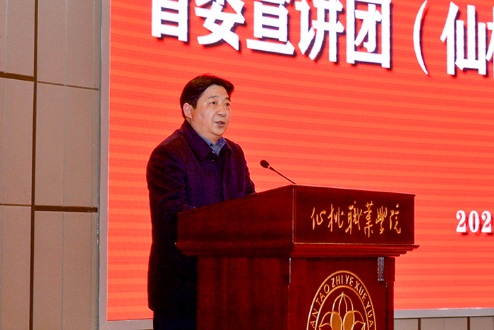 郭百高在主持报告会时强调,学习宣传贯彻党的十九届五中全会精神是当前和今后一个时期的重要政治任务。全院上下要以此次宣讲报告会为契机,进一步提高政治站位,迅速掀起学习宣传热潮,切实把思想和行动统一到全会精神上来。要在把握精神实质上下功夫、见实效。深刻领会全会的精神实质和丰富内涵,自觉做习近平新时代中国特色社会主义思想的坚定信仰者和忠实实践者,以实际行动增强“四个意识”、坚定“四个自信”、做到“两个维护”。要在深入学习宣传上下功夫、见实效。采取党委中心组带头学、支部主题党日学、个人自学等多种形式,纳入校内培训、主题团日、班会等活动,发挥好思政课主渠道作用,运用好学习强国平台等各类线上资源,一体推进网上网下学习宣传。要在推进学用结合上下功夫、见实效。自觉把学习宣传贯彻全会精神与贯彻落实习近平总书记关于职业教育的一系列重要论述、与落实立德树人根本任务紧密结合起来,牢牢把握党的建设、“双高”建设、新区建设、全国文明校园创建四大抓手,科学编制学院“十四五”发展规划,把学习成果转化为务实举措,全面推动学院高质量发展。