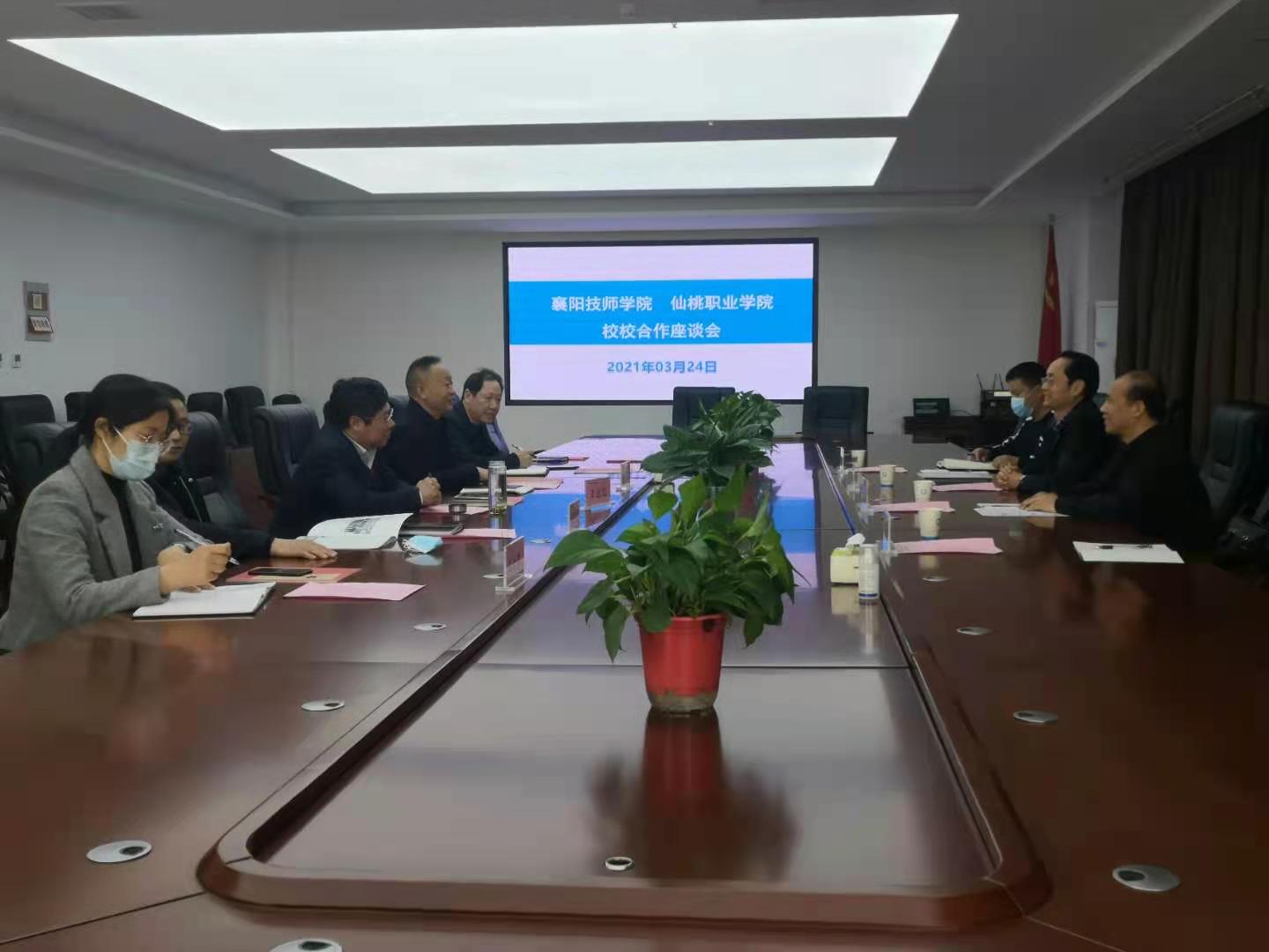 2021年3月24日,仙桃职业学院院长李立勇,教育学院党总支书记王权海,教育学院党总支副书记韦文华一行四人来到襄阳技师学院,与襄阳技师学院领导洽谈校校合作事宜。