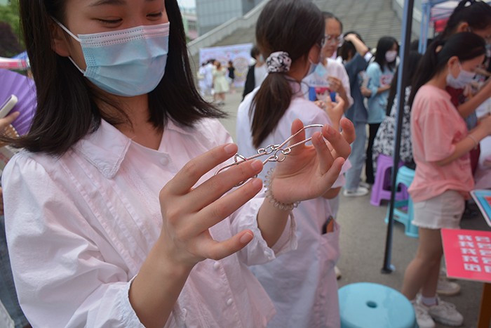 本次游园会精心设计了多个妙趣横生的环节,既有“追逐飘带”“智力大比拼”等游戏,也有“情系于绳”“我绘我心”“信手粘来”“等DIY手工制作,每个环节对应一个印章,根据印章数量兑换纪念品。关卡加礼物的设计吸引了众多学生前来打卡体验,加油声、呐喊声回荡在校园里,喜悦与欢乐洋溢在每个人的脸上。