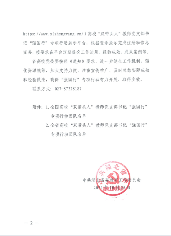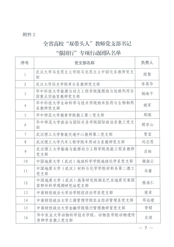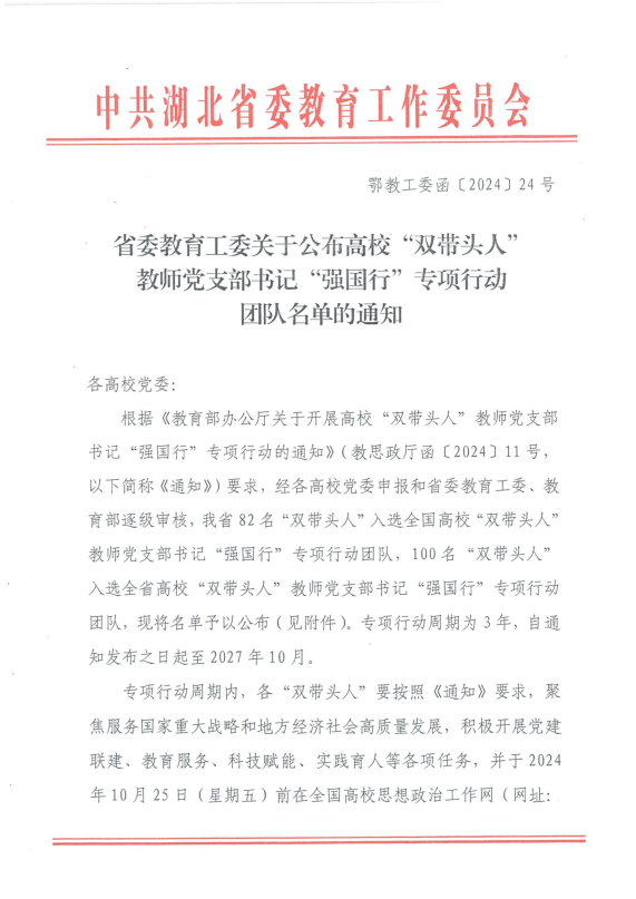 高校“双带头人”教师党支部书记“强国行”专项行动旨在充分发挥高校“双带头人”的示范引领作用,引导广大师生在以中国式现代化全面推进强国建设、民族复兴伟业新征程上砥砺新担当、展现新作为。专项行动为期三年,入选的支部在开展党建联建、提供教育服务、推动科技赋能、深化实践育人四个方面进行专项行动。