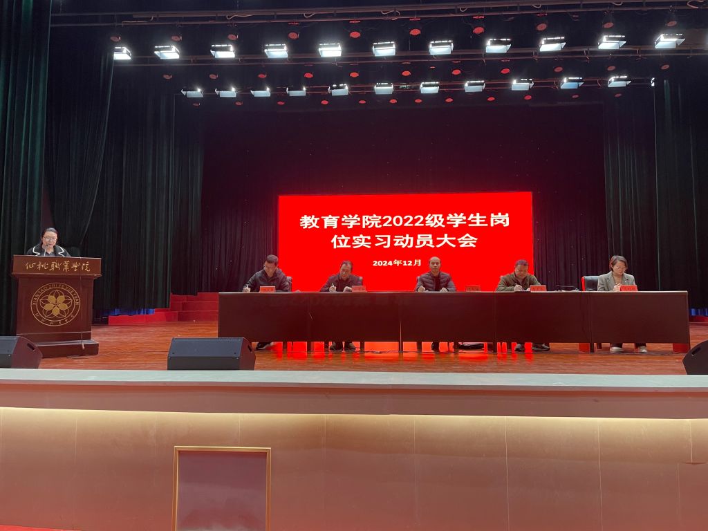 2024年12月2日下午,教育学院在文化艺术中心举办2022级学生岗位实习动员大会,教育学院班子成员、各科室负责人、2022级全体辅导员、2022级全体学生参与动员大会。会议由副院长湛天祥主持,本次动员会上各科室负责人分别解读和强调了以下内容:《2022级学生实习方案》、《实习管理要求》、《学前教育专业实习任务》、《小学教育专业实习任务》、《实习期间安全管理》,学生代表做了发言。
